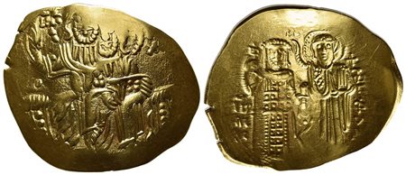 Empire of Nicaea, John III (1222-1254); AV Hyperpyron (g 4,20; mm 28; h 6). Magnesia, ca. 1232-1254. Christ Pantokrator enthroned facing; pellets at ends of throne, small cross above to l.; Rv. John standing facing, holding labarum, being crowned by the Theotokos. DOC 4c; Sear 2073. Good very fine