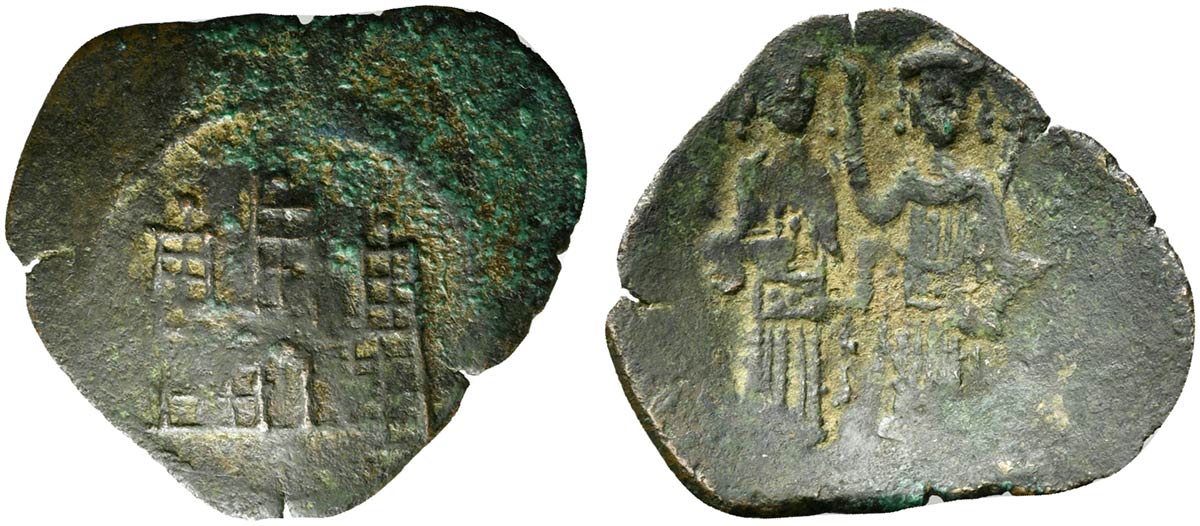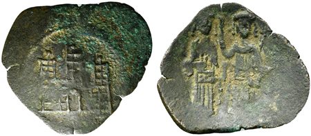 Michael II Comnenus-Ducas (Despot of Epiros, 1237-1271); BI Trachy (g 1,26; mm 23; h 6); Thessalonica; Two-towered city gate with central archway; behind, large central tower; Rv. Michael standing facing, being crowned by John III. Lianta 476-7; DOC 3; Sear 2237. Very Rare, green patina, good very fine