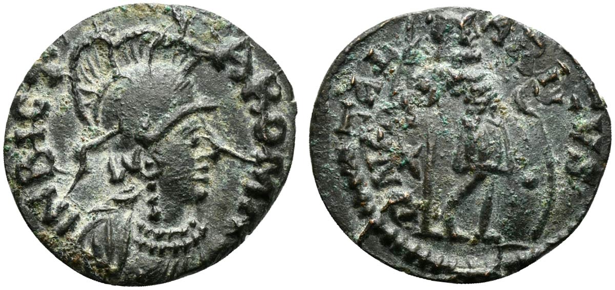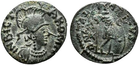 Ostrogoths, Athalaric (526-534); AE 10 Nummi (g 2,71; mm 18; h 6); Rome mint. Helmeted and cuirassed bust of Roma r.; Rv. Athalaric, in miltary attire, standing r., holding spear and shield; X (mark of value) to l.; S C across field. COI 85; MIB 77; MEC 1, 132. Green patina, good very fine
