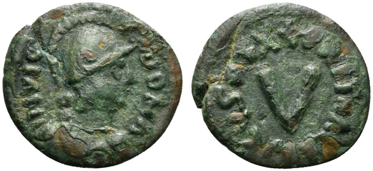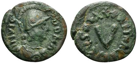 Ostrogoths, Athalaric (526-534); AE 5 Nummi (g 1,09; mm 14; h 5). Rome mint. Helmeted bust of Roma r.; Rv. + D N ATHALARICVS REX around large V. COI 87b; MEC 1, -. Green patina, good very fine
