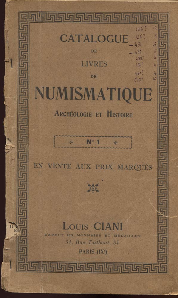 CIANI L. – Catalogue de livres de numismatique, archeology, histoire. N 1. Paris, s.d. pp. 29, nn. 882. Ril. ed. Sciupata, raro.