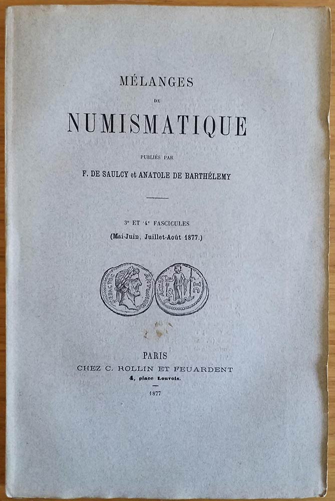 De Saulcy F. De Barthelemy A. Melanges de Numismatque. 3 et 4 Fascicules ( Mai-Juin-Juillet,Aout). Paris 1877. Brossura ed. pp. Da 144 a 334, tavv. Da VIII a XII in b/n. Intonso. Buono stato