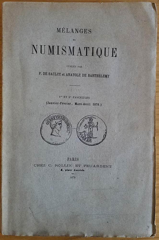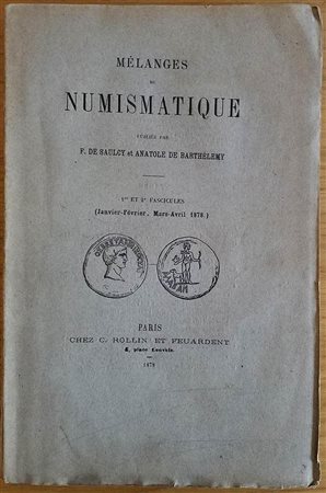 De Saulcy F. De Barthelemy A. Melanges de Numismatque. 1 et 2 Fascicules (Janvier- Fevrier-Mars- Avril) Paris 1878. Brossura ed. pp. 192, tavv V in b/n. Buono stato