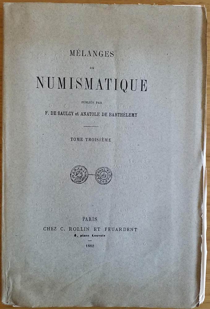 De Saulcy F. De Barthelemy A. Melanges de Numismatque. Tomo Troisieme . Paris 1882. Brosura ed. pp. Da 322 a 468, tavv. Da X a XVIII in b/n. Intonso. Buono stato