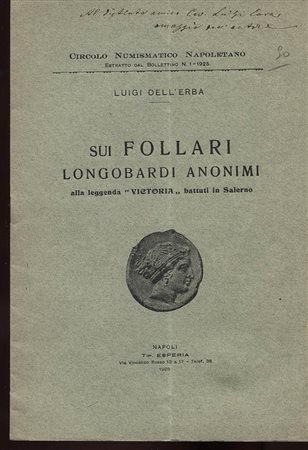 DELL’ERBA L. - Sui follari longobardi anonimi alla leggenda “ Victoria “ battuti in Salerno. Napoli, 1925. Pp. 16, ill. nel testo. ril. editoriale, buono stato, raro.