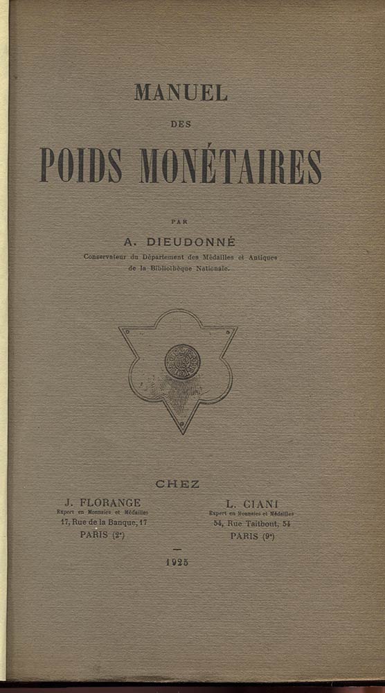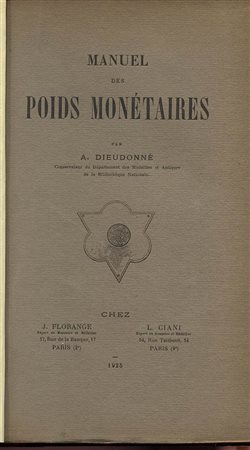 DIEUDONNE A. – Manuel des poids monetaires. Paris, 1925. Pp. 184, tavv. 16. Ril. \ pelle con scritte, buono stato, raro.
