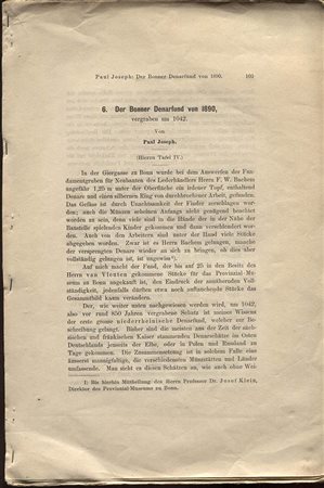 JOSEPH P. - Der Bonner denarfund von 1890 vergraben 1042. s.l., 189?. pp. 103 - 157, tavv. 1. brossura ed. Sciupata buono stato, importante e raro lavoro.