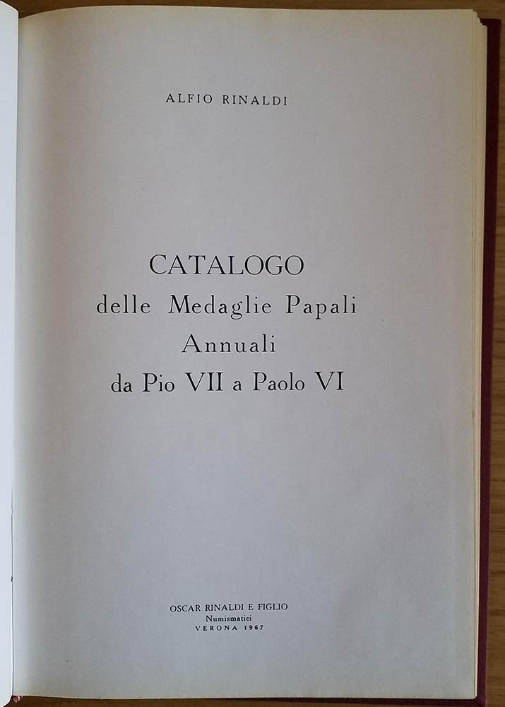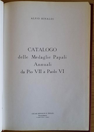 Rinaldi A. Catalogo delle Medaglie Papali Annuali da Pio VII a Paolo VI. Oscar Rinaldi e Figlio 1967. Tela ed. con titolo in oro al dorso e fregio al piatto, pp. 113, ill. in b/n. Buono stato
