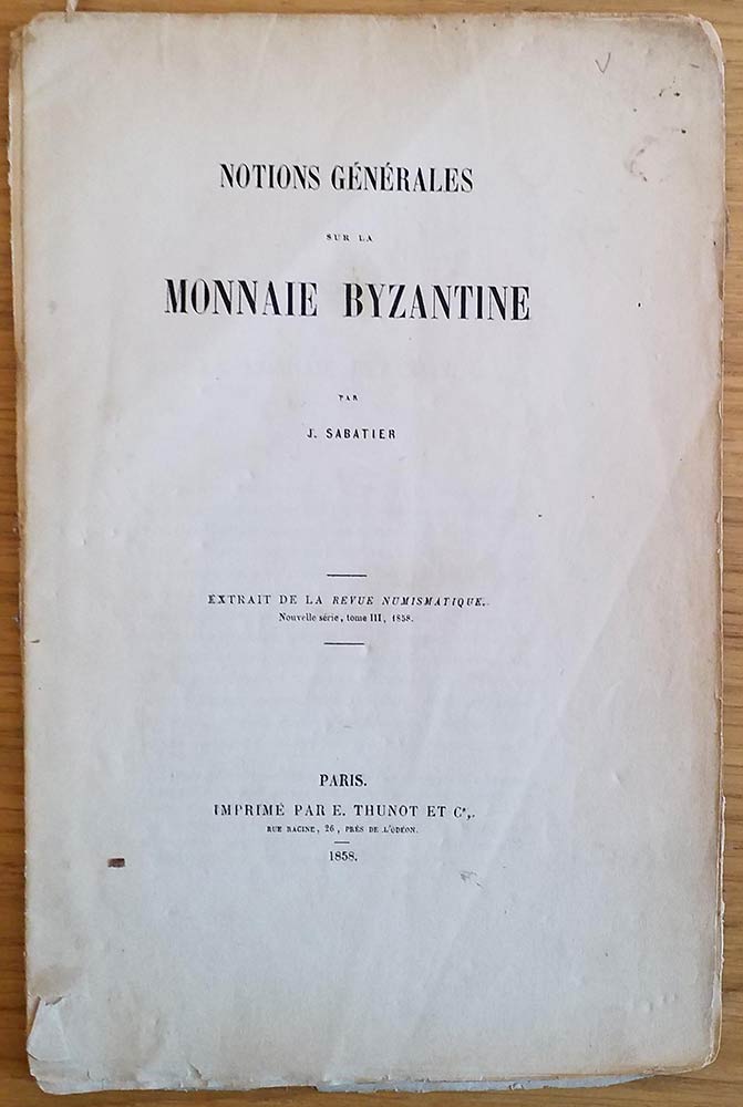 Sabatier J. Notions Generales sur la Monnaie Byzantine. Extraitbde la Revue Numismatique. Paris 1858. Brossura ed. pp. 27, tavv. Da VI a X in b/n. Parzialmente slegato.
