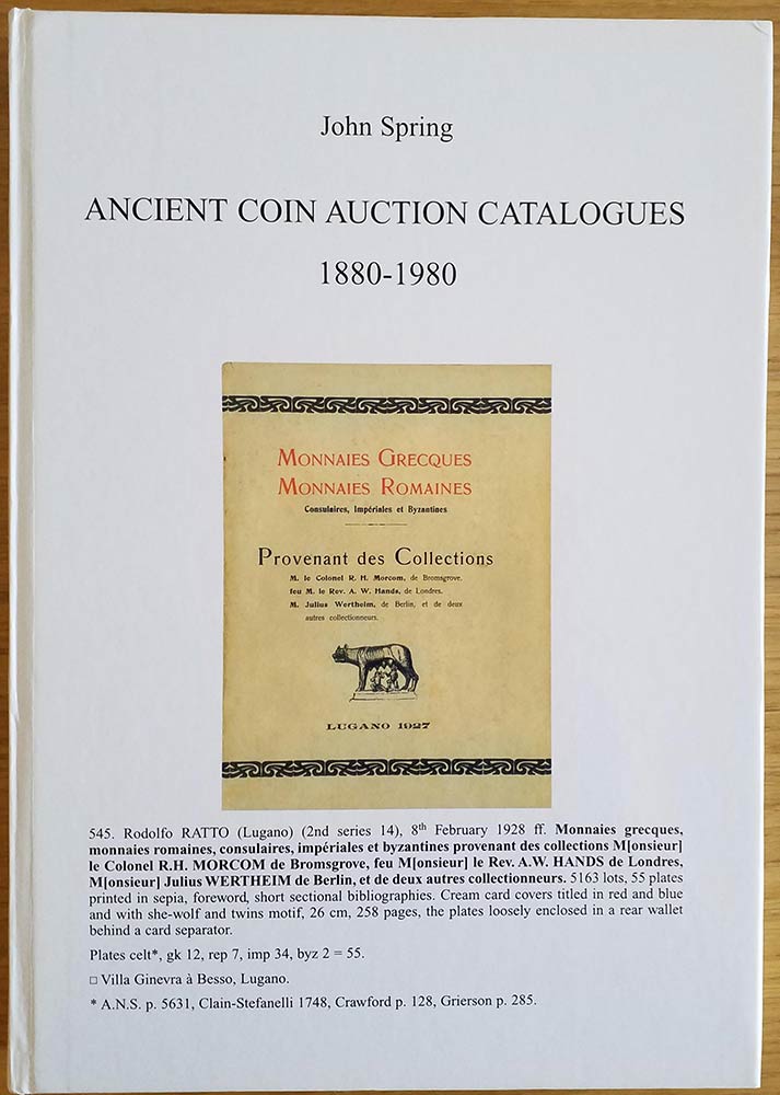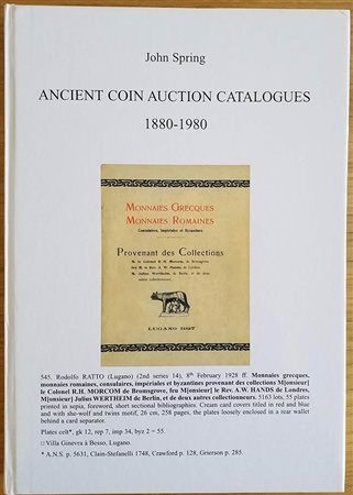 Sprin J., Ancient Coin Auction Catalogues, 1880-1980. Spink, London 2009. Cartonato editoriale, 374pp. Ill. in b/n.NUOVO This listing of 886 ancient coin auction catalogues aims to include every important sale of ancient coins, wh