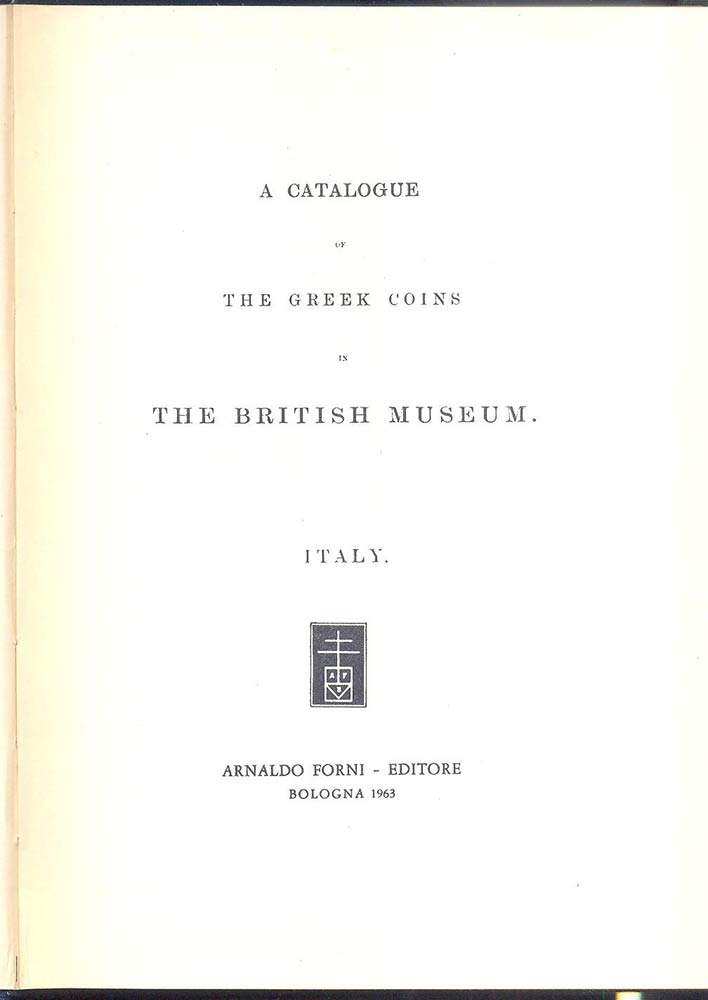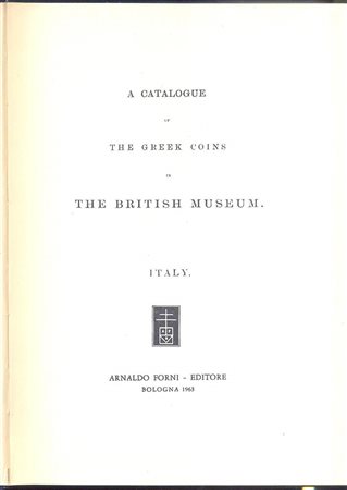 STUART POOLE R. - BMC. Catalogue of greek coins in the British Museum. Italy. Bologna, 1963. pp. 432, con illustrazioni nel testo. ril. editoriale tela blu, buono stato, raro.