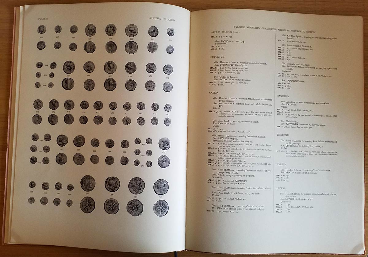 Sylloge Nummorum Graecorum The Collection of The American Numismatic Society. Part I Etruria – Calabria. New York 1969. Brossura ed. lotti 1618, tavv. 39 in b/n. Ottimo stato