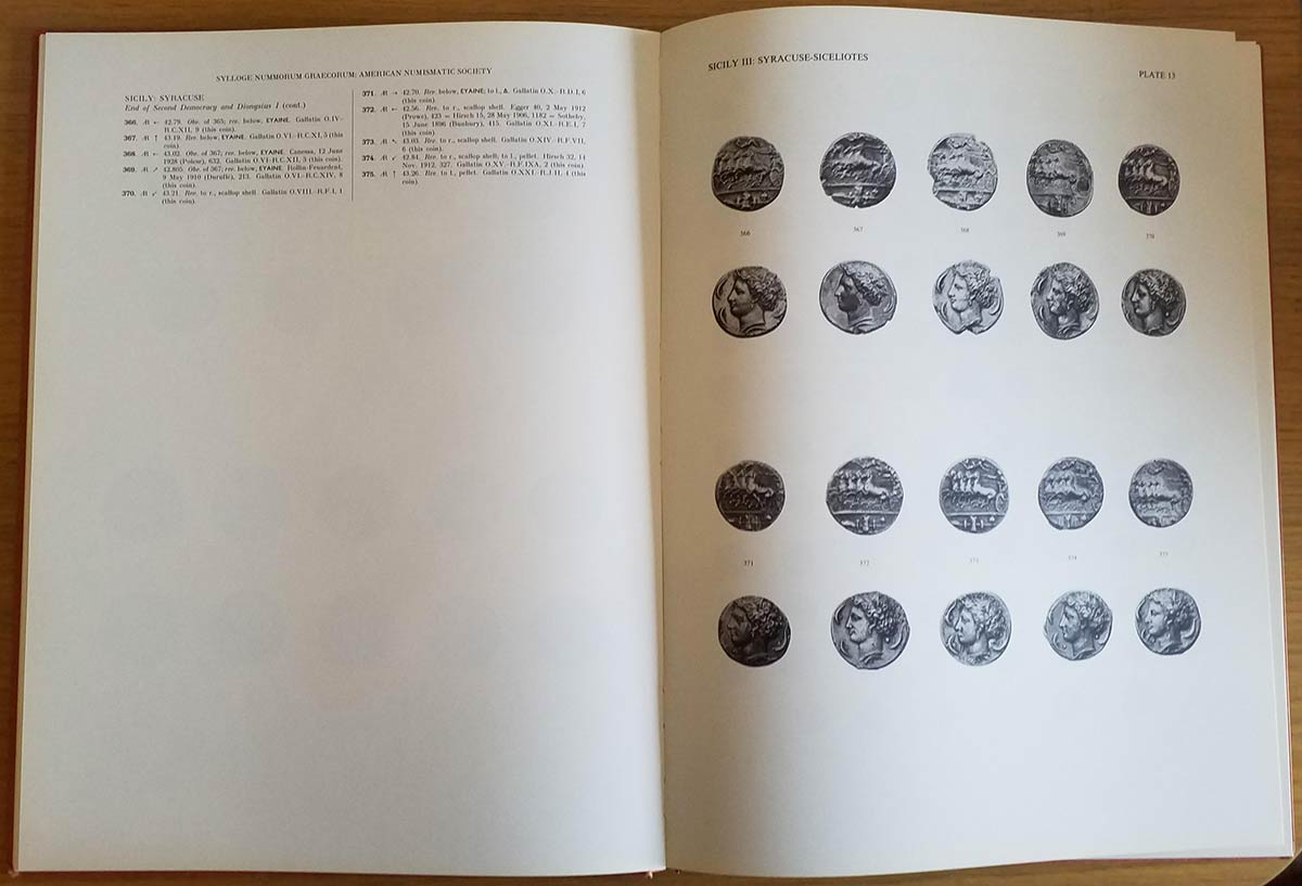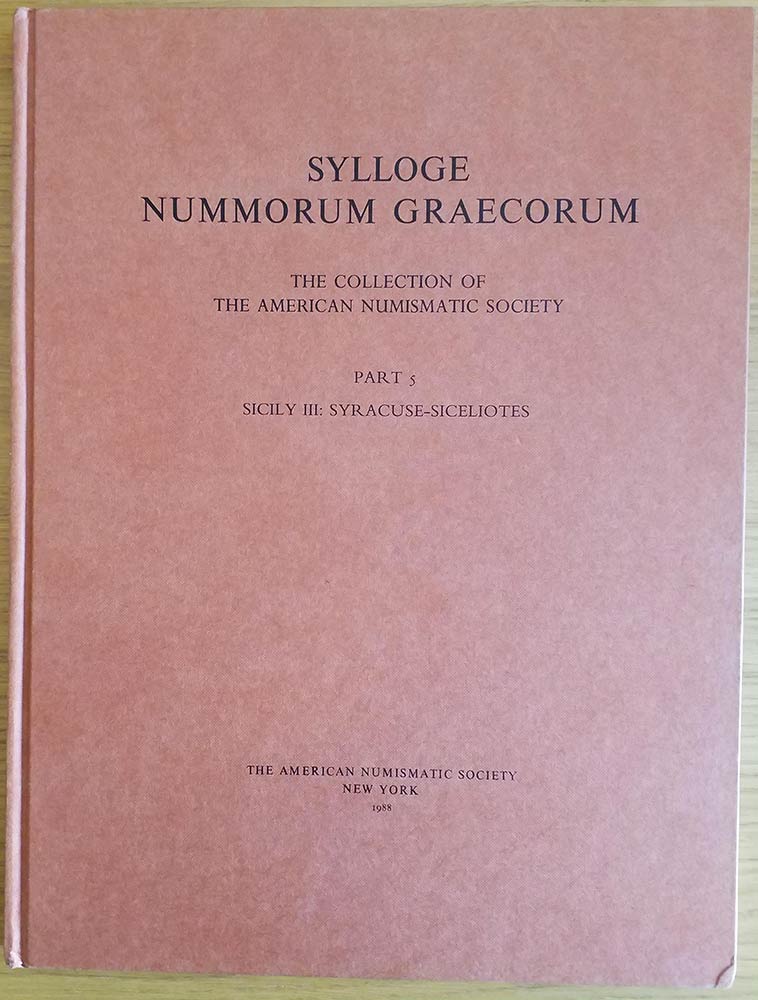 Sylloge Nummorum Graecorum The Collection of The American Numismatic Society. Part 5 Sicily III: Syracuse – Siceliotes. New York 1988. Cartonato ed. lotti 1408, tavv. 45 in b/n. Ottimo stato