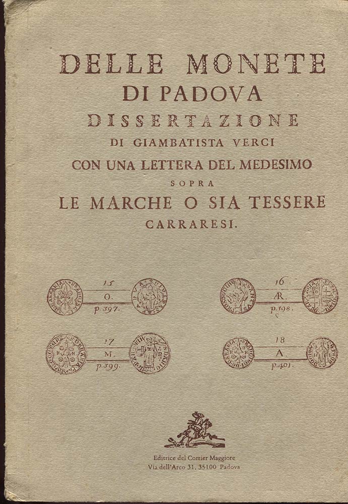 VERCI G. – Delle monete di Padova. Le marche o sia Tessere carraresi. Padova, 1978, ed. Di 100 esemplari. Ril. ed. Buono stato. Importante e raro.