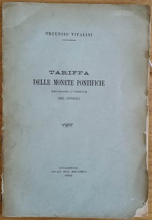 Vitalini O. Tariffa delle Monete Pontificie secondo l' ordine del Cinagli.Le Monete dei Papi giusta l' ordine seguito nelle Tavole Sinottiche del Dott. Angelo Cinagli con razionali criteri apprezzate da Ortensio Vitalini. Camerino Borgarelli 1882. Brossura ed. pp. 38. Parzialmente slegato.