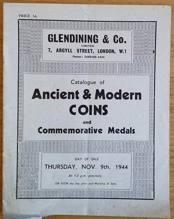 Glendining & Co. Catalogue of English & Foreign Coins. London 09 November 1944. Brossura ed. pp. 12, lotti 178. Buono stato