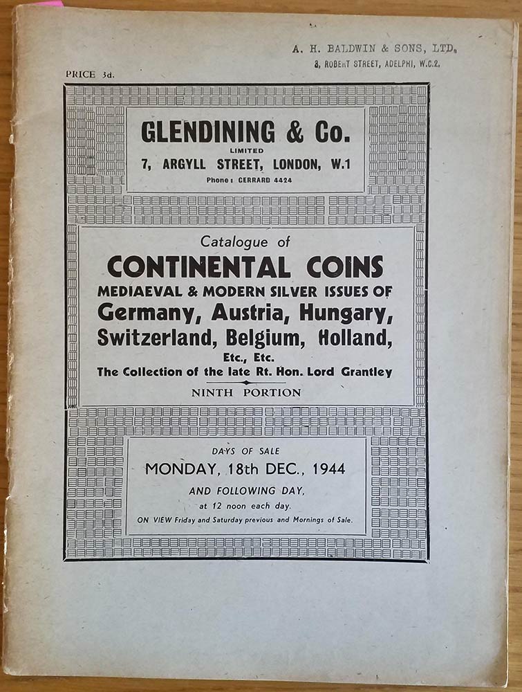 Glendining & Co. Catalogue of Continental Coins Mediaeval & Modern Silver Issues of Germany, Austria, Hungary, Switzerland, Belgium, Holland, Etc. The Collection of the late Rt. Hon. Lord Grantley Ninth Portion. London 18 December