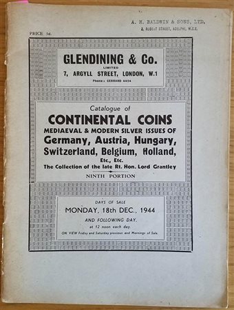 Glendining & Co. Catalogue of Continental Coins Mediaeval & Modern Silver Issues of Germany, Austria, Hungary, Switzerland, Belgium, Holland, Etc. The Collection of the late Rt. Hon. Lord Grantley Ninth Portion. London 18 December 1944. Brossura ed. pp. 55, lotti da 3347 a 3800. Annotazioni a matita. Buono stato