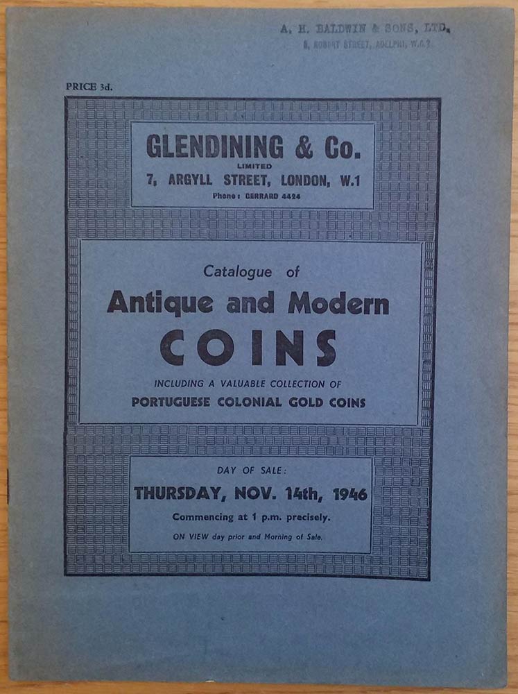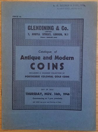 Glendining & Co. Catalogue of Antique and Modern Coins, including a valuable collection of Portuguese Colonial Gold Coins. 14 November 1946. Brossura ed. 17 lotti 236. Buono stato.