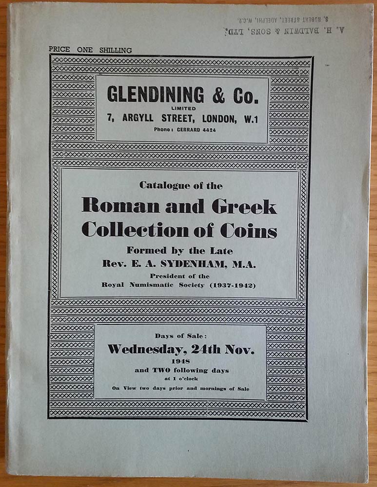 Glendining & Co. Catalogue of the Roman and Greek Collection of Coins formed by the late Rev. E.A. Sydenham, M.A. President of the Royal Numismatic Society (1937-1942) London 24 November 1948. Brossura ed. pp. 123, lotti 983. Buon