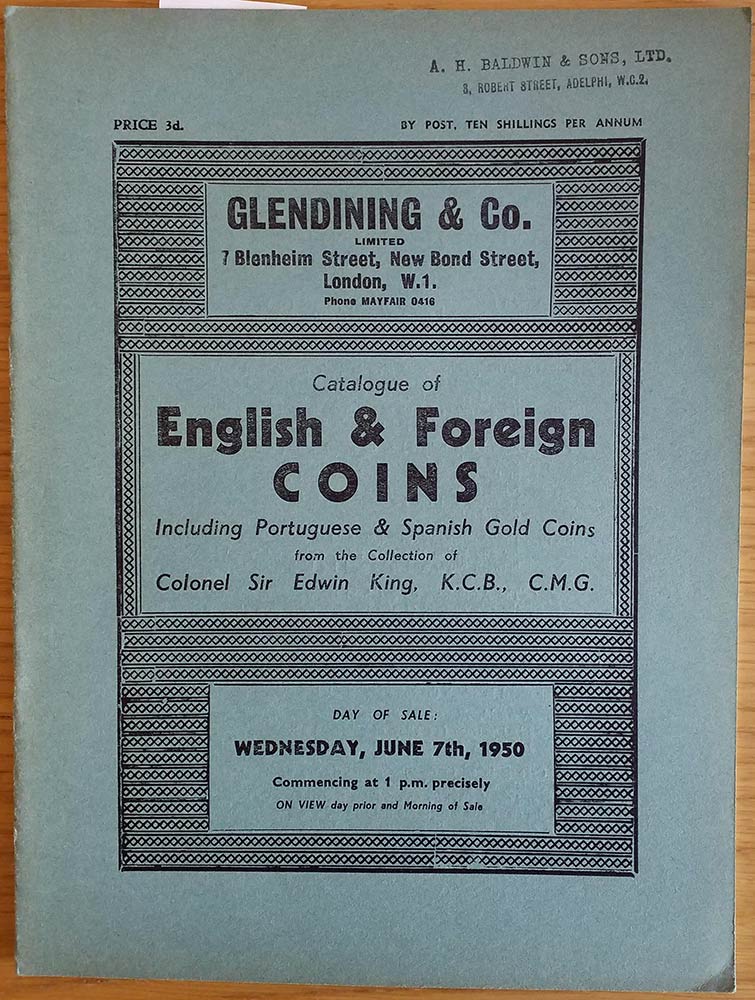 Glendining & Co. Catalogue of English & Foreign Coins Including Portuguese & Spanish Gold Coins from the Collection of Colonel Sir Edwin King K.C.B., C.M.G. London 07 June 1950. Brossura ed. pp. 27, lotti 350, tav. 1 in b/n. Buono