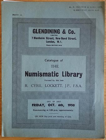 Glendining & Co. Catalogue of the Numismatic Library formed by the late R. Cyril Lockrtt, J.P., F.S.A. London 06 October 1950 Brossura ed. pp. 8, lotti 85. Buono stato