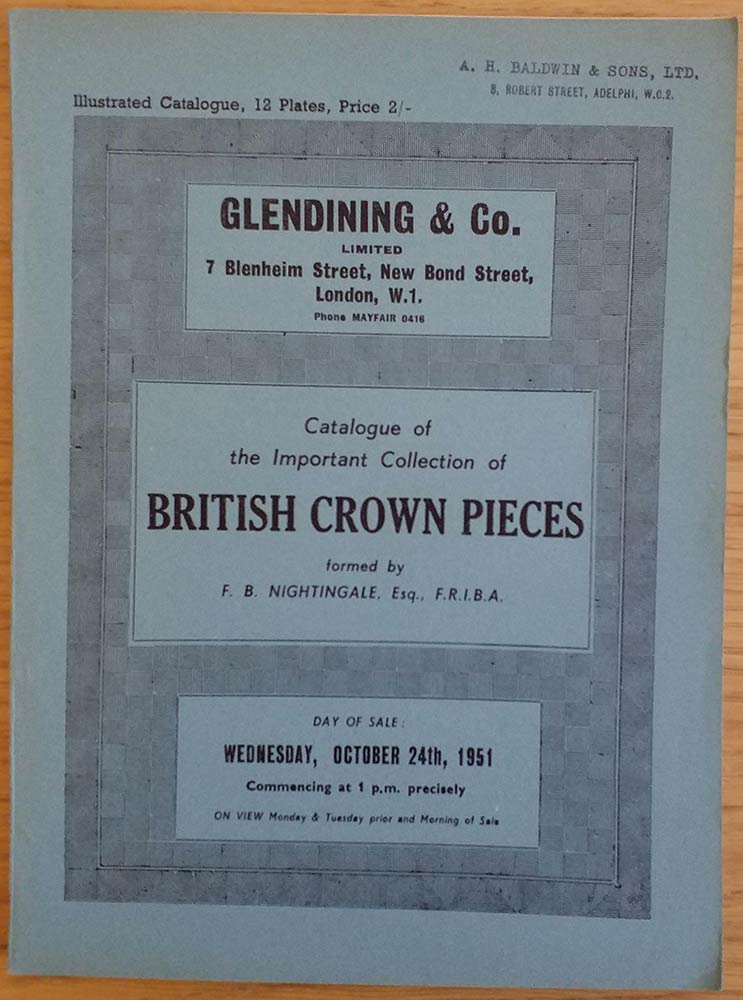 Glendining & Co. Catalogue of the Important Collection of British Crown Pieces formed by F.B. Nightingale Esq., F.R.I.B.A. London 24 October 1951. Brossura ed. pp. 27, lotti 246, tavv. XII in b/n. Buono stato.