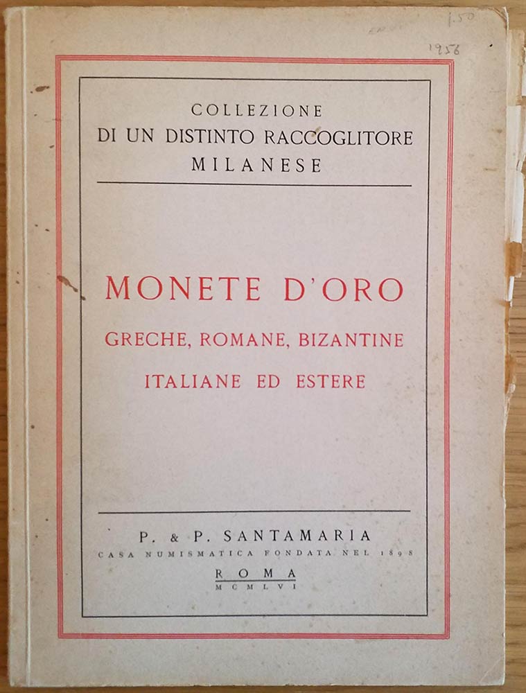 Santamaria P.P. Collezione di un Distinto Raccoglitore Milanese Monete D' Oro Greche, Romane, Bizantine, Italiane ed Estere. Roma 06 Giugno 1956. Brossura ed. pp. 28, lotti 293, tavv. 12 in b/n. Con lista prezzi di stima. Buono stato
