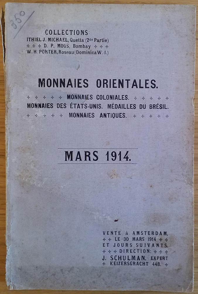 SCHULMAN J. – Amsterdam 30-3-1914. Collections Ithiel J. Michael II partie, D.P. Moss, Bombay, W.H. Porter,Roseau ( Dominica W. I.) Monnaies orientalales, monnaies coloniales, monnaies des Etat-Unis, medailles du Brasil, monnaies