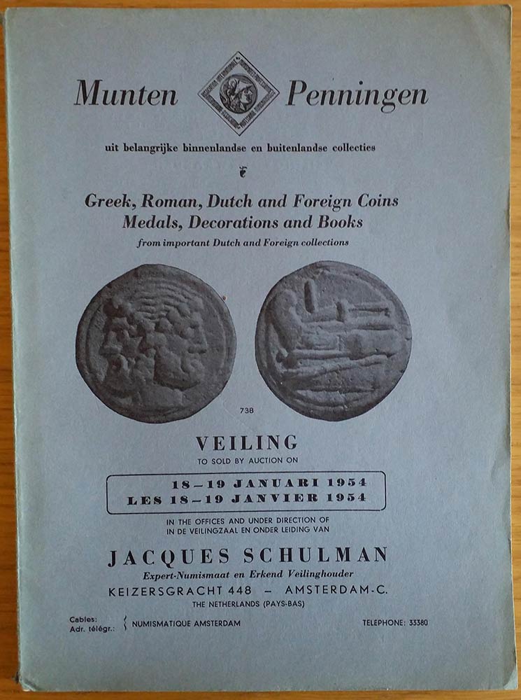 Schulman J. Munten en Penningen Greek, Roman, Dutch and Foreign Coins, Medals, Decorations and Books. Amsterdam 18-19 Januari 1954. Brossura ed. pp. 70, lotti 1496, tavv. XX in b/n. Buono stato
