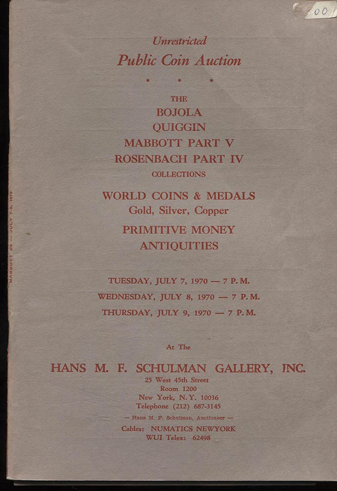 Lot 2530 | SCHULMAN H. M.F. GALLERY, INC. The collection, Bojola, Quiggin, Mabbott part IV, Rosenbach part IV. Wordl coins & medals, ancient gold, silver, copper. Primitve money antiquities. New York, 7 – July – 1970. Pp. 100, nn. 1372, tav