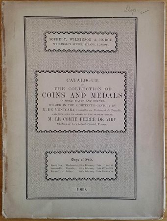 Sotheby, Wilkinson & Hodge Catalogue of The Collection of Coins and Medals in Gold, Silver and Bronze, formed in The Eighteenth Century by M. De Montcara. 24 February 1909. Brossura ed. pp 48, lotti 470, tavv. VI in b/n. Tav. 6 staccata. Buono stato