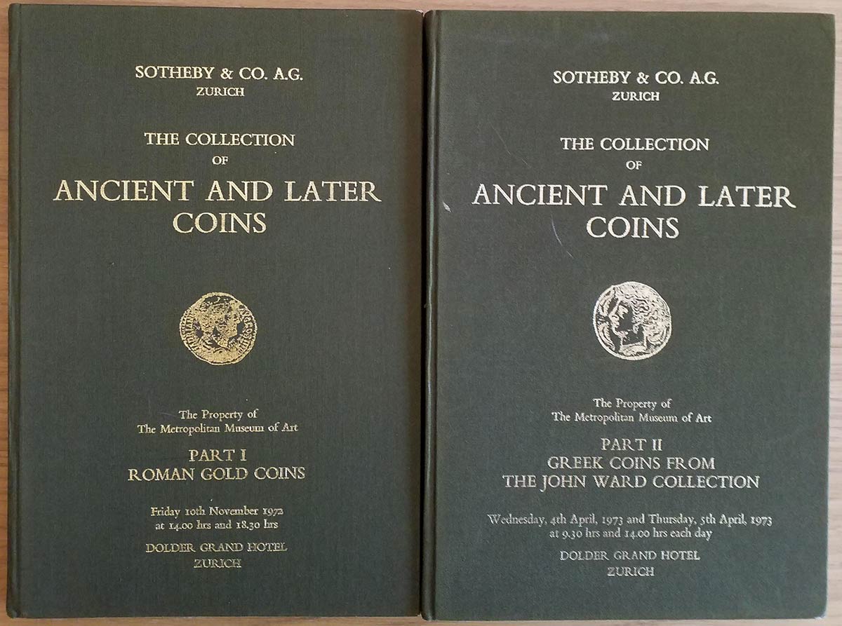 Sotheby & Co. 2 voll. Parte I e II. Part I. The Collection of Ancient and Later Coins, The Property of The Metropolitan Museum of Art . Roman Gold Coins.10 November 1972. Tela ed. con titolo in oro al dorso e al piatto, lotti 347, tavv. Di ingrandimenti VII in b/n, ill in b/n. Con lista prezzi di realizzo. Part II The Collection of Ancient and Later Coins, The Property of The Metropolitan Museum of Art. Greek Coins from The John Ward Collection. 04-05 April 1973. Tela ed. con titolo in oro al dorso e al piatto, lotti 773, tavv. 31 in b/n. Note a penna dei prezzi di realizzo e dei relativi Acquirenti. Buono stato