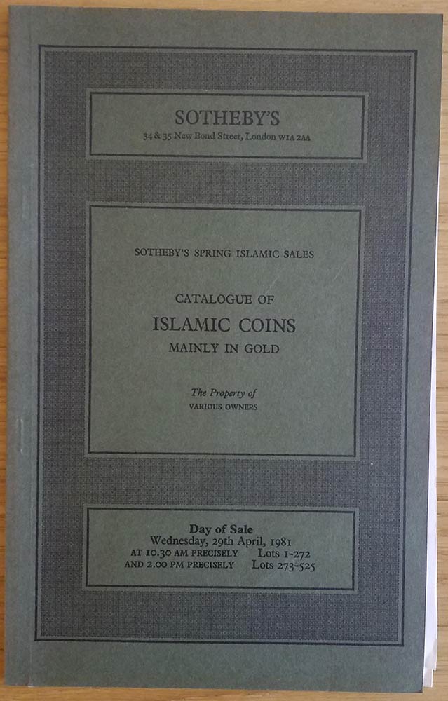 Sotheby's Catalogue of Islamic Coins Mainly in Gold, comprising Coins of most of the Islamic Dynasties. London 29 April 1981. Brossura ed. lotti 525, tavv. In b/n. Con lista prezzi di stima e di realizzo. Ottimo stato