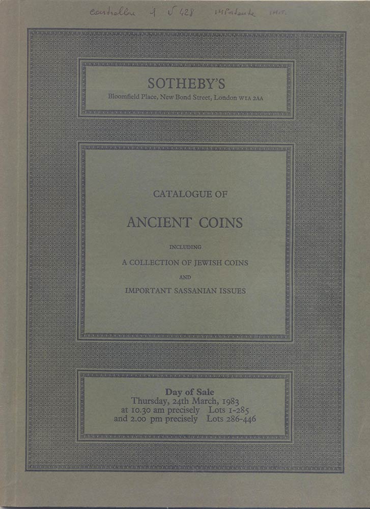SOTHEBY’S. Catalogue of ancient coins including a collection of Jewsh coins and important sassaia issues. London, 24 – March, 1983. pp. non numerate, nn. 446, tavv. 7. Ril. editoriale, buono stato, lista prezzi Val. e Agg. importa