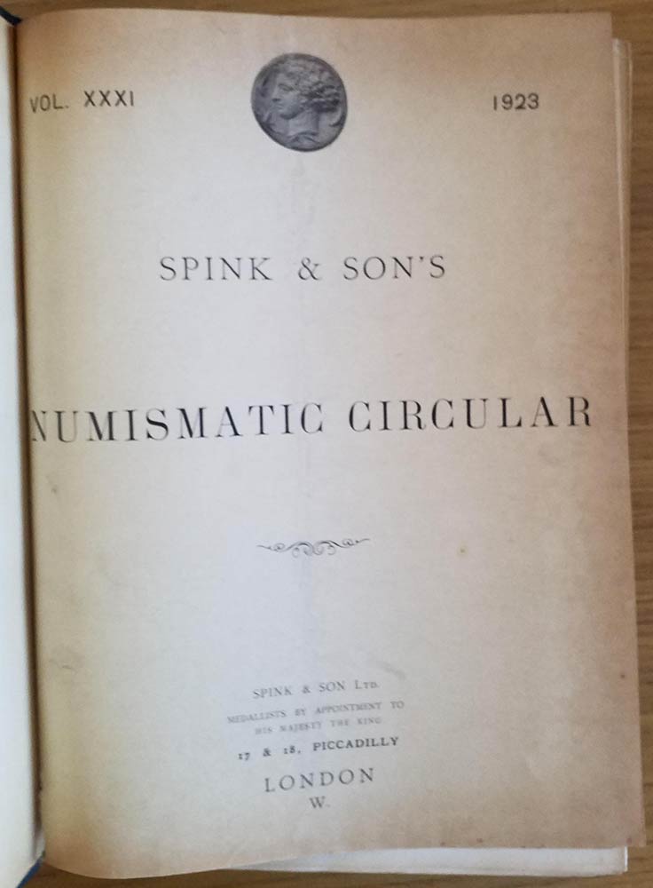 Spink & Son's Numismatic Circular Annate complete. 1923-1925. Mezza tela con titolo al dorso, ill. In b/n. Copertina riparata. Buono stato