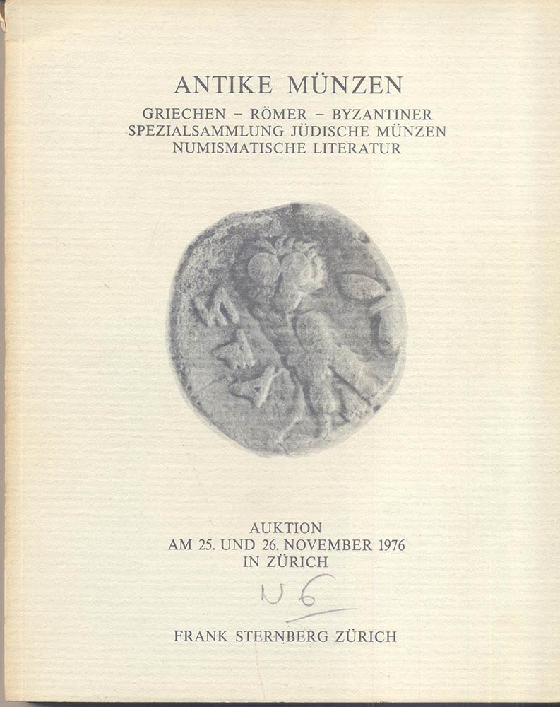 STERNBERG F. – Auktion 6. Antike munzen; Griechen – Romer – Byzantiner – Spezialsammlung Judiche munzen, numismatiche literatur. Zurich, 25 – November – 1976. Pp. 148, nn. 1180, tavv. 49. Ril. editoriale, buono stato, lista prezzi Val. e Agg. importante collezione di monete della Palestina. Raro
