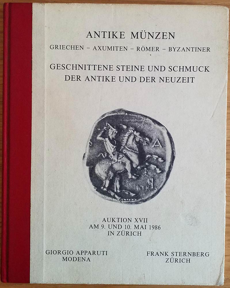 Sternberg F. Apparuti G. Auktion XVII. Antike Munzen Griechen, Romer, Byzantiner, Geschnittene Steine und Schmuck der Antike und der Neuzeit. Zurich 09-10 Mai 1986. Cartonato ed. pp.100, lotti 742, tavv. 7 a colori, XLII in b/n. C