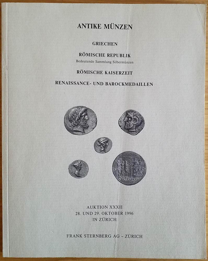 Sternberg F. Auktion XXXII, Antike Munzen Griechen, Romische Republik Bedeutende Sammlung Silbermunzen. Romische Kaiserzeit. Renaissance- und Barockmedaillen. Zurich 28-29 Oktober 1996. Brossura ed. pp. 96, lotti 889, tavv. 3 a co