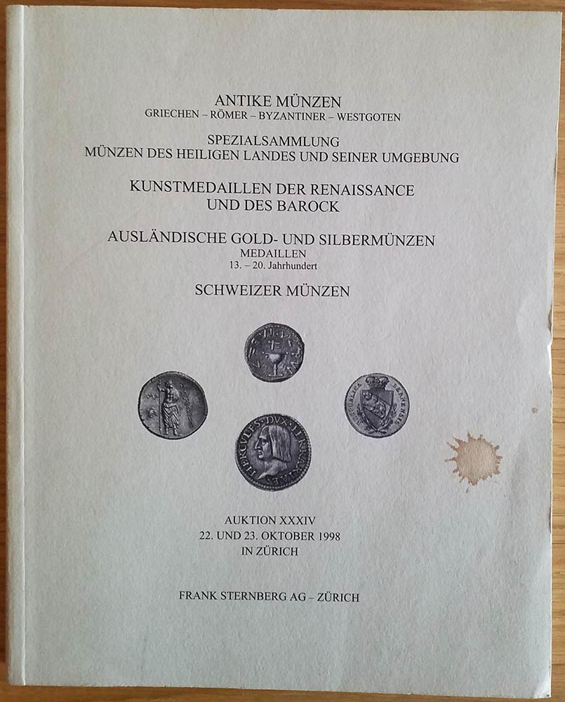 Sternberg F. Auktion XXXIV, Antike Munzen Griechen, Romer, Byzantiner, Westgoten. Spezialsammlung Munzen des Heiligen Landes und Seiner Umgebung. Kunstmedaillen der Renaissance und des Barock. Auslandische Gold und Silbermunzen Me