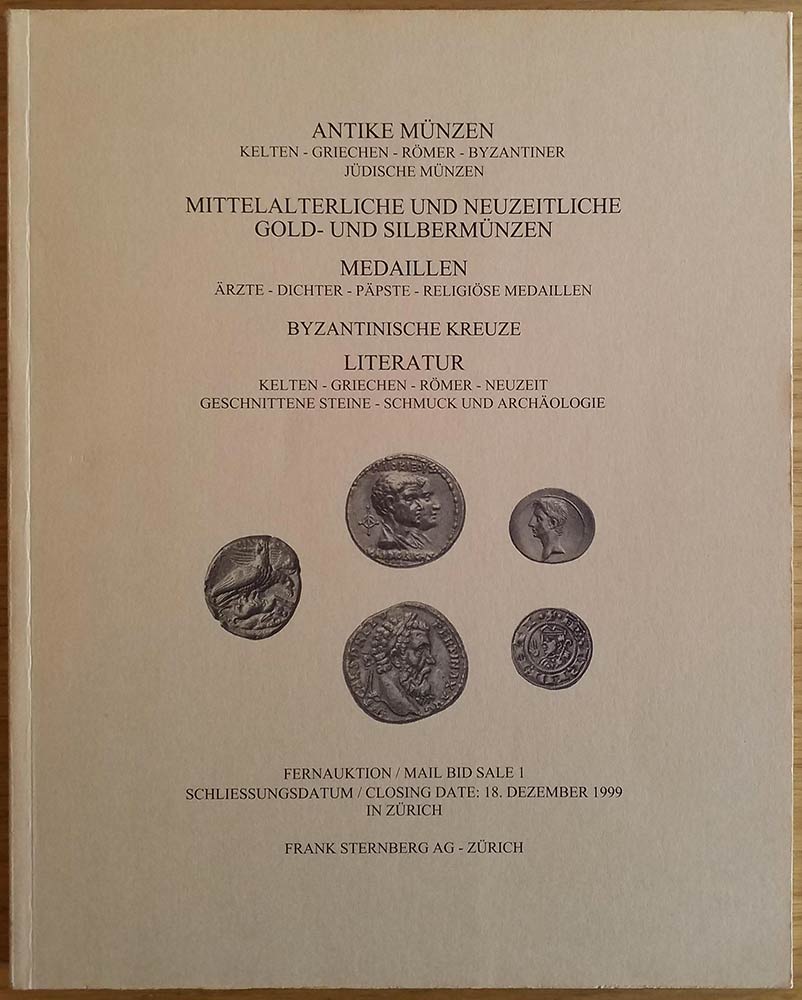 Sternberg F. Antike Munzen Kelten, Griechen, Romer, Byzantiner, Judische Munzen. Mittelalterliche und Neuzeitliche Gold und Silbermunzen. Medaillen Arzte, Dichter, Papste, Religiose Medaillen. Byzantinische Kreuze. Literatur Kelten Griechen, Romer, Neuzeit, Geschnittene Steine, Schmuck und Archaologie. Zurich 18 Dezember 1999. Brossura ed. pp. 142, lotti 1302, tavv. LXX in b/n, tavv. 6 ingrandimenti in b/n. Buono stato