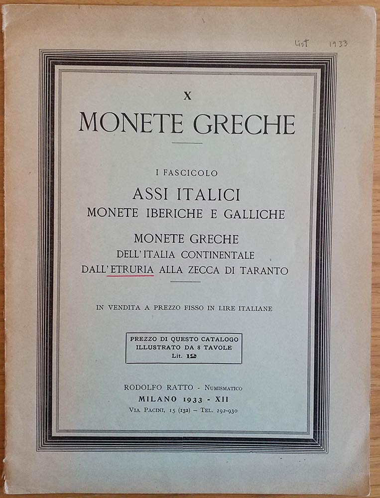 Ratto R. Listino X monete Greche I Fascicolo Assi Italici. Monete Iberiche e Galliche. Monete Greche dell' Italia Continentale, dall' Etruria alla Zecca di Taranto. Milano 1933. Brossura ed. pp. 16, lotti 545, tavv. VIII in b/n. T