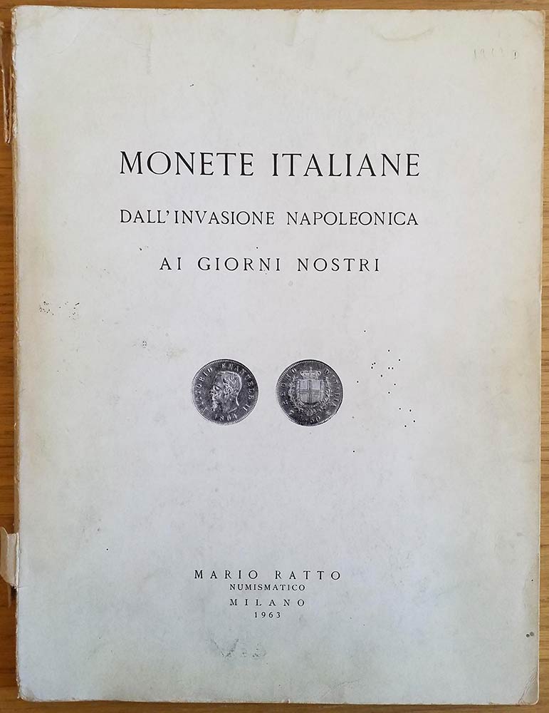 Ratto M. Monete Italiane dall'Invasione Napoleonica ai giorni nostri. Milano 29-30 Marzo 1963. Brossura ed. lotti 700, Tavv. In b/n. Con lista prezzi di stima. Strappi al dorsetto. Buono stato