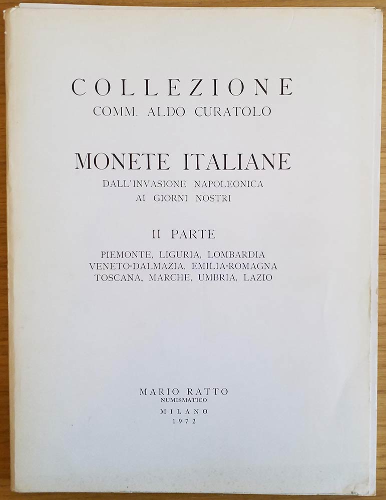 Ratto M. Collezione Aldo Curatolo Monete Italiane dall' Invasione Napoleonica ai giorni nostri. II Parte Piemonte, Liguria, Lombardia, Veneto-Dalmazia, Emilia Romagna, Toscana, Marche, Umbria, Lazio. Milano 09-10-11-12 Marzo 1972.