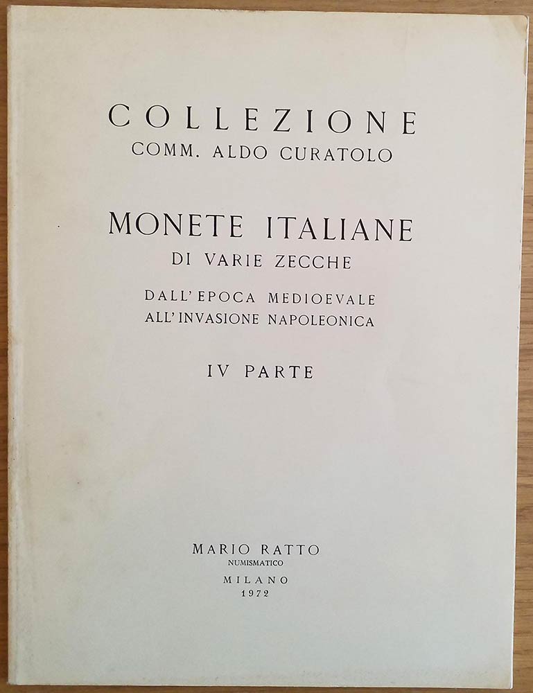 Ratto M. Collezione Aldo Curatolo Monete Italiane di varie Zecche dall' Epoca Medioevale all' Invasione Napoleonica. Parte IV. Milano 25 Novembre 1972. Brossura ed. pp. 16, lotti 227, tavv. 13 in b/n. Note a matita dei prezzi. Buo