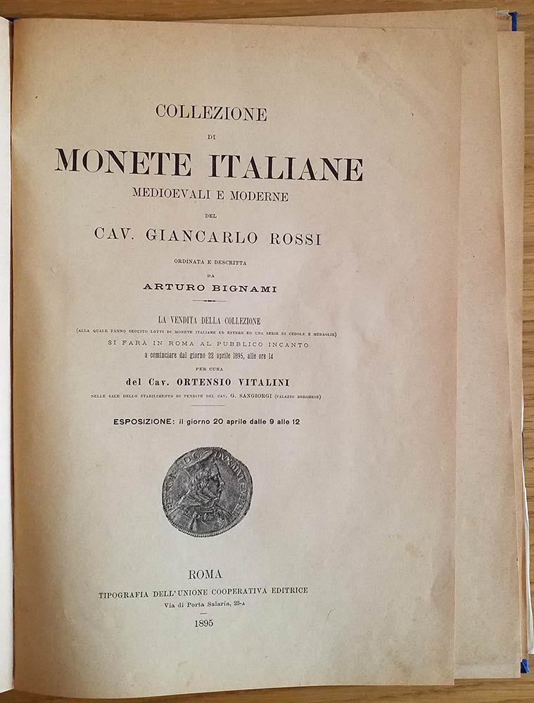 VITALINI ORTENSIO – Roma 22-4-1895. Collezione di monete italiane medioevali e moderne del Cav. Giancarlo Rossi. pp. 142, nn. 1318, tavv. 3 ril./ tela raro