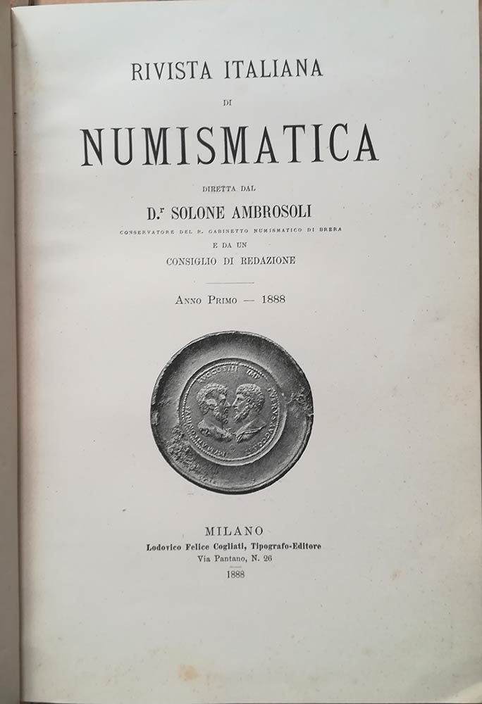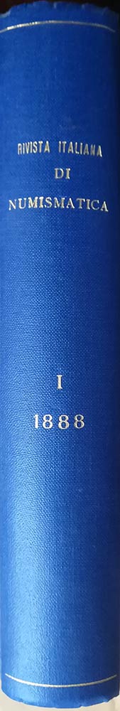 AA.VV. Rivista Italiana di Numismatica 1888 - GNECCHI Francesco ed Ercole, Di alcune monete inedite e sconosciuti della zecca di Scio - AMBROSOLI Solone, Il ripostiglio di Lurate Abbate - ROSSI Umberto, I medaglisti del rinascimento alla corte di Mantova (parte I) - MULAZZANI Giovanni, Studi economici sulle monete di Milano (parte I) - MOTTA Emilio, Gli zecchieri di Milano nel 1479 - GNECCHI Francesco, Appunti di numismatica Romana (parte I) - ROSSI Umberto, I medaglisti del rinascimento alla corte di Mantova (parte II) - OSTERMANN Valentino, Le medaglie Friulane del secolo XV e XVI - AMBROSOLI Solone, Di una monetina Trivulziana con S. Garpoforo - GNECCHI Ercole, Documenti inediti della zecca di Correggio - GAVAZZI Giuseppe, A proposito delle monete di Giancarlo Visconti - ANCONA Amilcare, Il ripostiglio di San Zeno in Verona città - GNECCHI Francesco, Appunti di numismatica Romana (parte II) - MULAZZANI Giovanni, Studi economici sulle monete di Milano (parte II) - ROSSI Umberto, Francesco Marchi e le medaglie di Margherita d'Austria - PAPADOPOLI Nicolò, Alcune notizie sugli intagliatori della zecca di Venezia - TAMASSIA F., Di una moneta inedita Mantovana - AMBROSOLI Solone, Di uno scudo progettato per San Marino - GNECCHI Francesco ed Ercole, Di alcune monete inedite e sconosciute della zecca di Scio (appendice) - GAVAZZI Giuseppe, Ricerca sul fiorino d'oro di Gian Galeazzo Visconti - ROSSI Umberto, I medaglisti del rinascimento alla corte di Mantova (parte III) - RUGGERO Giuseppe, Annotazioni numismatiche Genovesi - AMBROSOLI Solone, Una medaglia inedita del museo di Brera - MIARI Fulcio, Moneta d'oro del principe Siro da Correggio. Annata completa. Pp. 512, tavv. 12. Rilegatura in tela blu con scritte e fregi in oro al dorso