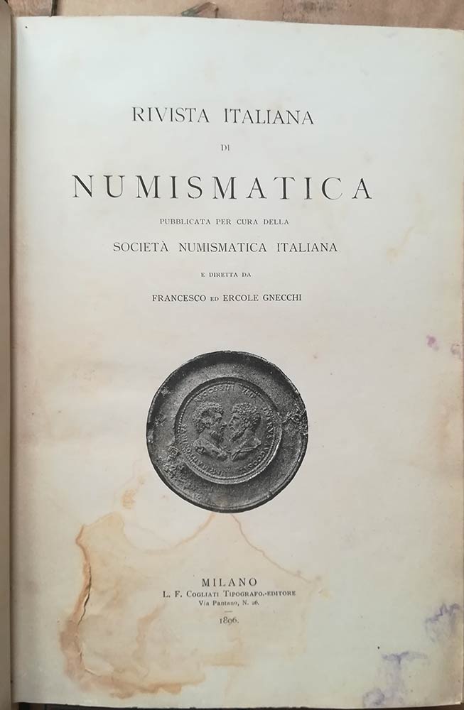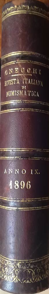 AA.VV. Rivista Italiana di Numismatica 1896 - GNECCHI Francesco, Appunti di Numismatica romana - CAPOBIANCHI Vincenzo, Il Denaro Pavese - RUGGERO Giuseppe, Annotazioni Numismatiche Genovesi - CIANI Giorgio, Frinco e Messerano monete inedite - MORSOLIN Bernardo, Una medaglia satirica - MOTTA Emilio, Documenti Viscontei Sforzeschi - AMBROSOLI Solone, Bibliografia numismatica di Giangiacomo De Medici - GNECCHI Francesco, Appunti di Numismatica romana - LISINI A. , Medaglie di zecche Italiane - RICCI Serafini, Il ripostiglio consolare - MOTTA Emilio, Documenti Viscontei Sforzeschi - GNECCHI Francesco, Appunti di Numismatica romana - PAPADOPOLI Nicolò, Monete Italiane inedite della raccolta Papadopoli - RUGGERO Giuseppe, Annotazioni Numismatiche Italiane - RUGGERO Giuseppe, Annotazioni Numismatiche Genovesi - OSTERMAN Valentino, Di un ritrovo di monete Veneziane Veronesi e Trentine - MOTTA Emilio, Documenti Viscontei Sforzeschi - GNECCHI Francesco, Appunti di Numismatica romana - DATTARI G. , Monete dei Nomi delle antiche province e città dell'Egitto - AMBROSOLI Solone, Di un singolare cavallotto al tipo Bellinzonese - FRATI Luigi, Di un Ducato doro inedito di Leone X coniato a Bologna - MORSOLIN Bernardo, Medaglia in onore di Callisto VI - MORSOLIN Bernardo, Medaglie commemorative coniate durante il Dogato di Venezia - RIZZOLI Luigi, Sigillo di Rinaldo degli Scrovegni - KUNZ Carlo, Jacopo III Mandelli Conte di Maccagno e le sue monete. Annata completa. Pp. 524, tavv. 9. Rilegatura in mezza pelle marrone e scritte e fregi in oro al dorso