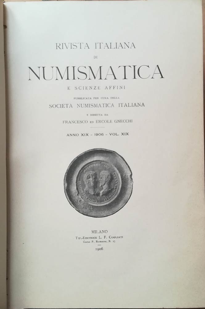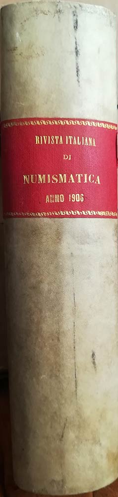 AA.VV. Rivista Italiana di Numismatica 1906 - CASTELLANI C. , Il ripostiglio di San Polo di Piave - DATTARI G. , Contribuzioni al Corpus-Zecca di Alessandria - PANSA Giovanni, Intorno al problema dei così detti "NUMMI TINCTI" argentati e dorati - HAEBERLIN E. J. , Del più antico sistema monetario presso i romani - AGOSTINI A. e PAPADOPOLI N. , Ungaro inedito della zecca di Castiglione delle Riviere - MARCHISIO A. F. , Un piccolo ripostiglio scoperto nel Vercellese - GNECCHI Francesco, Appunti di Numismatica Romana- scavi di Roma nel 1905 - PANSA Giovanni, Le monete dei Peligni - DATTARI G. , Contribuzioni al Corpus-Zecca di Cizico - PICCIONE M. , Le due F dell'aureo di M.Antonio Figlio - GNECCHI Francesco, nota al Le due F dell'aureo di M. Antonio Figlio - HAEBERLIN E. J. , Del più antico sistema monetario presso i romani - GNECCHI Ercole, Appunti di Numismatica Italiana-Le zecche Italiane - CARBONELLI G. , L'officina di un falso monetario del XIV Secolo - GNECCHI Francesco, Appunti di Numismatica Romana-Intorno ai medaglioni - GABRICI Ettore, Relazioni artistiche e religiose - LAFFRANCHI L. , La cronologia delle monete di Adriano - DATTARI G. , Nuova teoria sopra il Sistema Monetario - PANSA Giovanni, Nuovo contributo alla teorica delle contromarche monetarie presso i romani - STETTINER P. , La zecca di Pistoia - BISCARO G. , Altri due documenti sulla zecca Pavese - NUVOLARI F. , Curiosità Numismatiche Guastallesi - GNECCHI Francesco, Appunti di Numismatica Romana - gli dei i semidei e gli eroi... - DATTARI G. , Contribuzioni al Corpus- Delle monete Romane dell'epoca Costantiniana - PAPADOPOLI Nicolò, Le monete anonime di Venezia - SCHIAVEZZI B. , Ripostiglio di monete del secolo XV rinvenuto presso Pola - HAEBERLIN E. J. , Del più antico sistema monetario presso i romani. Annata completa. Pp. 676, tavv. 28. Rilegatura in mezza pergamena e tassello rosso con scritte e fregi in oro