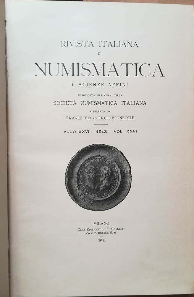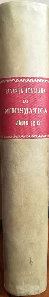 AA.VV. Rivista Italiana di Numismatica 1913 - GNECCHI Francesco, Appunti di Numismatica Romana - CESANO Lorenzina, Ripostiglio di Alba di Massa - PAPADOPOLI Nicolò, Monete italiane inedite della Raccolta Papadopoli - STETTINER P. , Una moneta ossidionale di Malta - MAGNAGUTI Alessandro, Studi intorno alla zecca di Mantova - MARCHISIO A.F. , Elenco di un piccolo ripostiglio di monete scoperte a S. Secondo di Pinerolo - GNECCHI Francesco, Appunti di Numismatica Romana - PAPADOPOLI Nicolò, Monete italiane inedite della Raccolta Papadopoli - CAGIATI Memmo, Una rettifica per la classìfica delle monete coniate nella zecca di Messina da Federico II e Federico III d'Aragona - VALERANI Flavio, Il ripostiglio di Trino Vercellese - CORA Luigi, Un testone inedito di Carlo II di Savoia - MOTTA Emilio, La medaglia d'oro del Cantone Ticino del 1804 - BOSCO Emilio, Contraffazione inedita della zecca di Passerano - RICCI Serafino, Il tesoretto monetale gallico di Verdello - GNECCHI Francesco, Appunti di Numismatica Romana - LAFFRANCHI Lodovico, La monetazione di Augusto - PANSA Giovanna, L'Officina monetaria di Lanuvio e gli attributi di Giunone Sospita - DATTARI G. , Intorno alle forme da fondere Monete Imperiali Romane - CAGIATI Memmo, Le monete del Gran Conte Ruggiero spettanti alla Zecca dì Mileto - MAGNAGUTI Alessandro, La più illustre Collezionista del Rinascimento - CASTELLANI G. , Lettere di Guido Antonio Zanetti ad Annibale degli Abbati Olivieri Giordani di Pesaro - DATTARI G. , Intorno alle forme da fondere Monete Imperiali Romane - CESANO Lorenzina, Della moneta Enea corrente in Italia nell' ultima età imperiale romana e sotto i re Ostrogoti - DI DONATO Paolo Derege, Una emissione finora ignota di pezze da un centesimo fatta sotto il Regno di Carlo Alberto nel 1847 - A. C. C. G. , Due contraffazioni inedite di Frinco e di Passerano. Annata completa. Pp. 594, tavv. 10. Rilegatura in mezza pergamena e tassello rosso con scritte e fregi in oro
